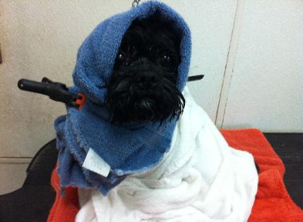 Many dogs then get the burrito treatment, designed to help pull moisture out of the coat, and speed drying time. We also use absorbent mats on the drying table and hoodie tubes over the ears both to help with drying and protect pet's sensitive ears from the noise of the dryer.