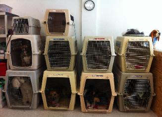 Pets are then placed into wire holding crates and ambient temperature fans are used to get the last bits of moisture out of the coat. Pets that cannot tolerate the force dryer are also dried in this manner. Temperature and humidity of the drying area are monitored for pet safety and efficient drying.
